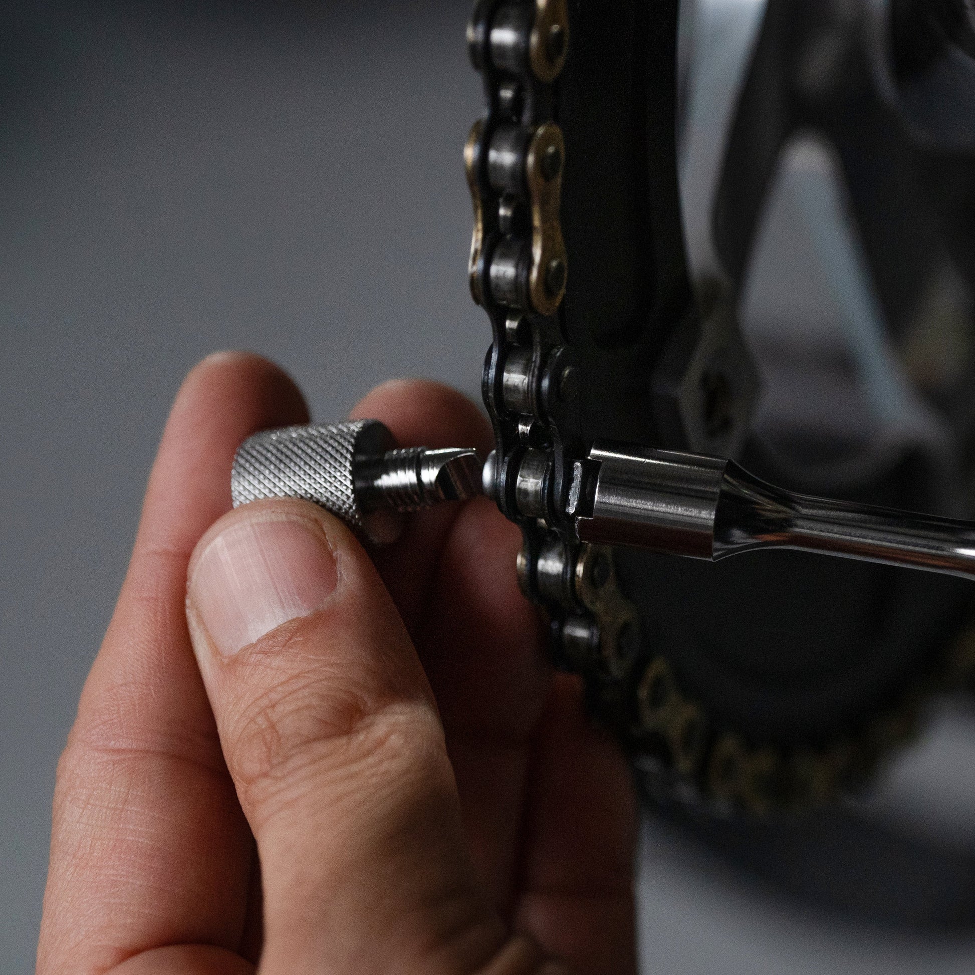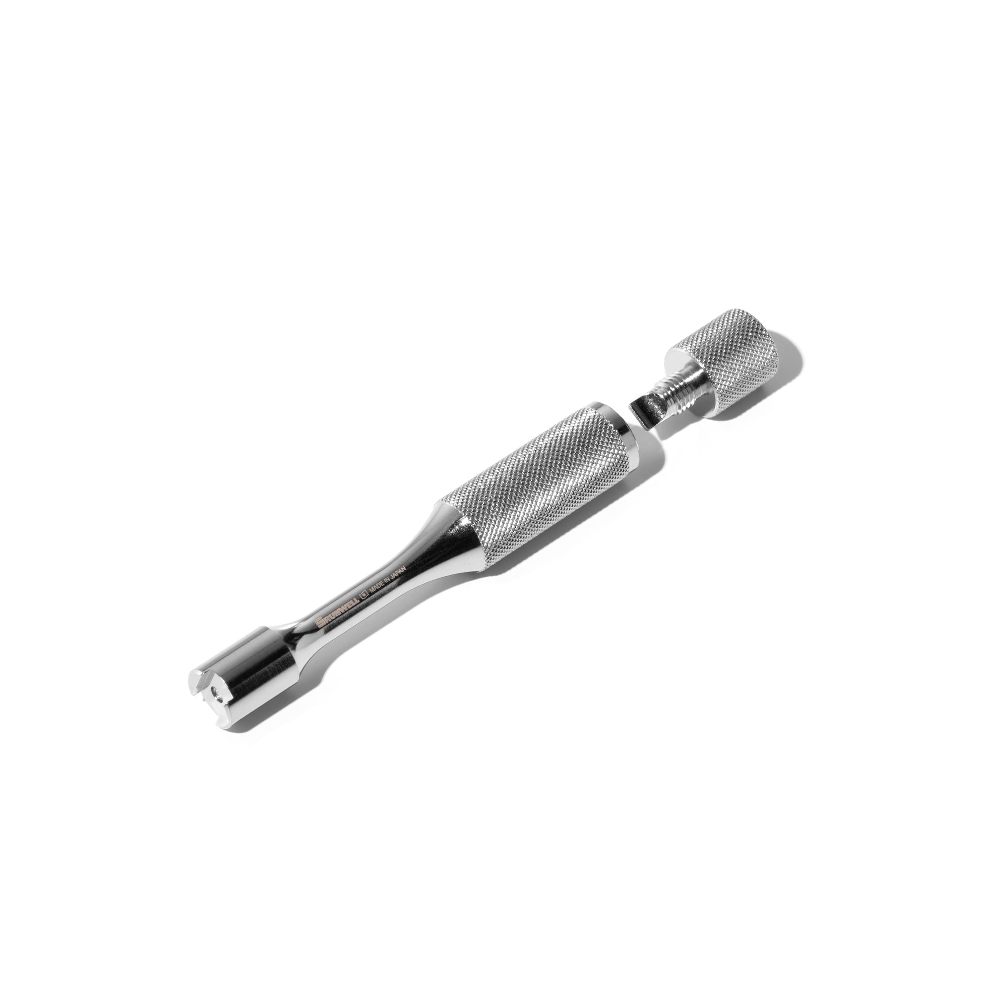 The BOUNCER is a specialized tool for turning bolts and nuts at the joints of truck chains. Combining the functions of a flathead screwdriver and pliers, the BOUNCER can be used to check for looseness, tighten, and remove plate nuts. The screwdriver and wrench are knurled for anti-slip performance, making them ideal for delicate work.