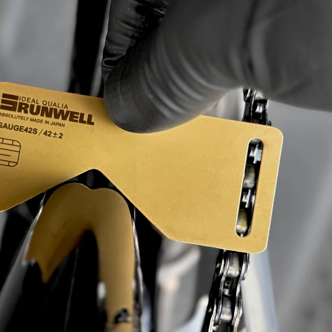 The golden card-type gauge allows you to check the chain line with one touch to ensure the best performance. This gauge is useful during inspections at busy racing tracks.