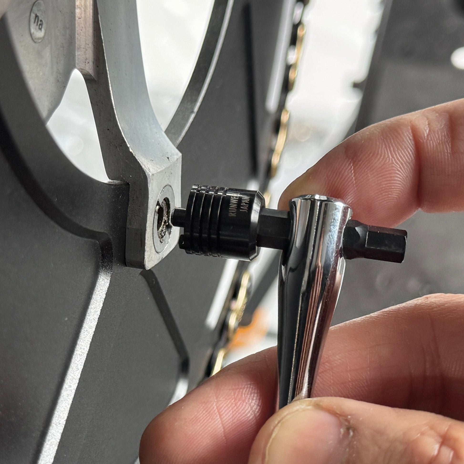 KUROKO is a special tool used to tighten and loosen the bolts that secure the chainring and crank. When tightening or loosening the chainring bolts, KUROKO's two claws firmly grip the groove on the back of the chainring bolt to prevent it from rotating.