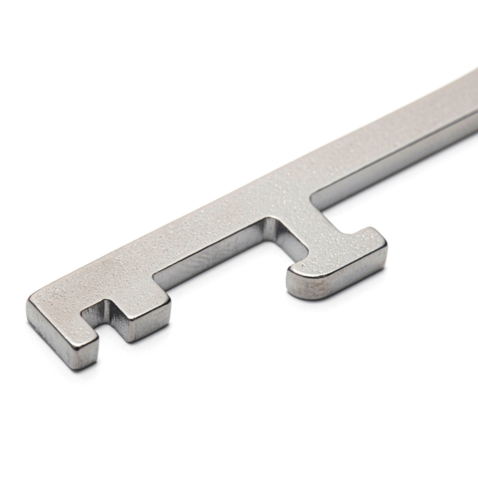 Keychain-type bottle opener featuring a traditional skeleton key. Hexagonal hole can be used as a 10mm spanner.