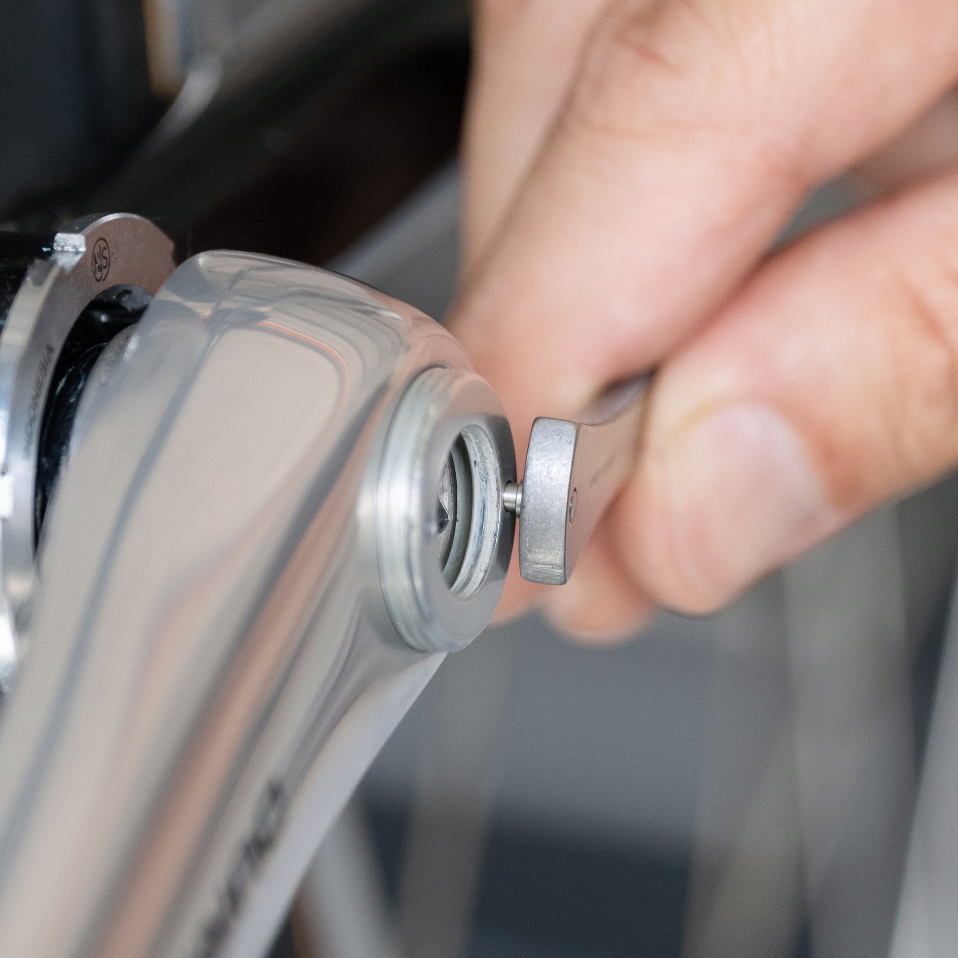 PINS7710 is a dedicated tool made of stainless steel for tightening and loosening crank caps. Press-made tools can slip when torque is applied without fitting the cap properly, causing scratches on the crank cap with the tip of the tool. To solve this problem, we machined out a pin that fits into the hole in the crank cap, threaded it, and attached it to the handle.